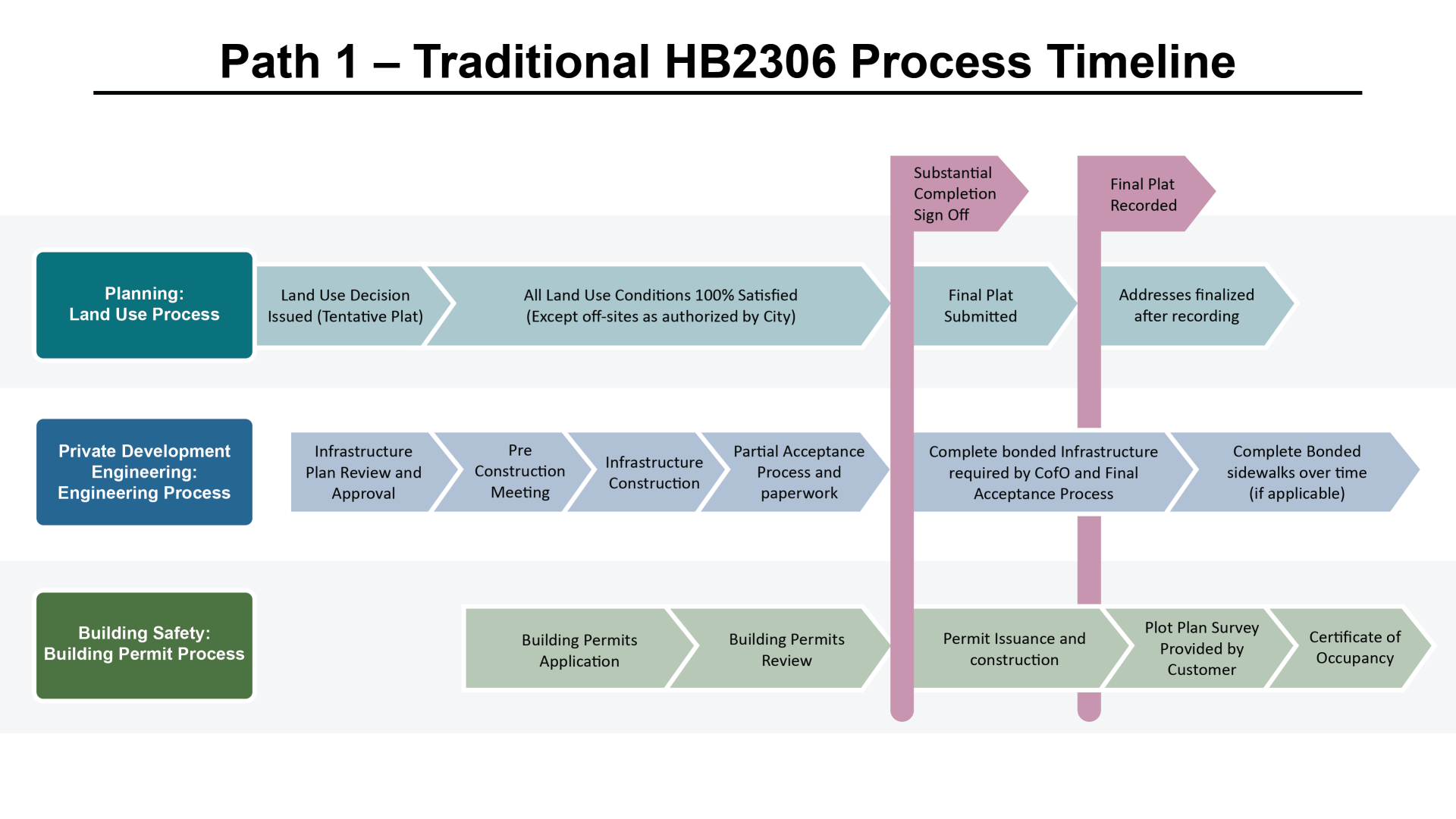 The overall goal is once the infrastructure process is completed and signed off, the Final Plat can be immediately approved and recorded. Building permits can then be issued quickly after the Final Plat is recorded. With proper project management and coordination with the City, this should help reduce the developer's overall timeline for building permit issuance by 2-4 months compared to the current procedures.