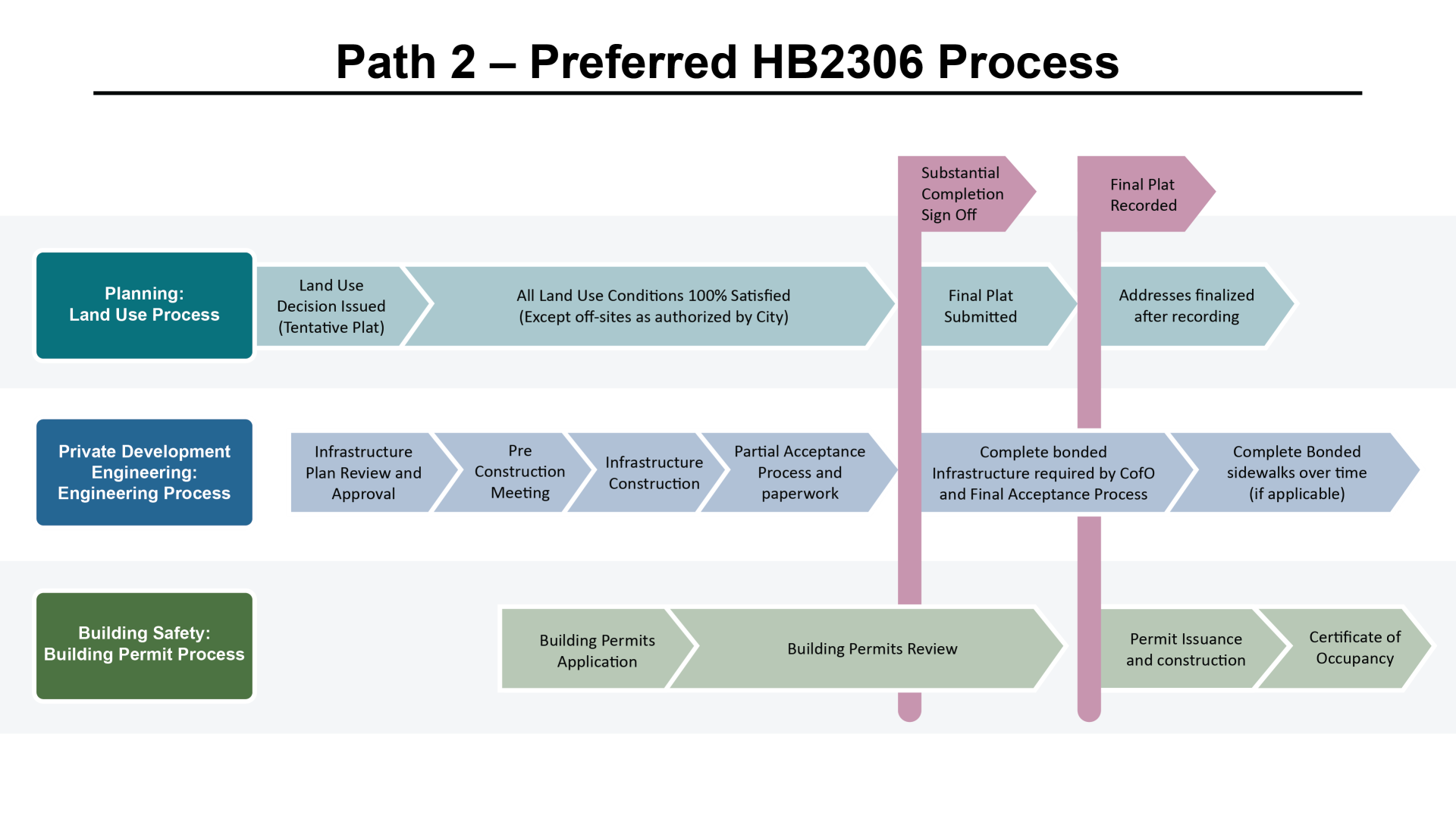 In response to House Bill 2306, the City of Bend has created three different processes to speed up the time between subdivision approval and the issuing of building permits. The first process follows House Bill 2306 exactly. The other two processes adjust the City’s current methods for recording a subdivision’s Final Plat and issuing building permits.