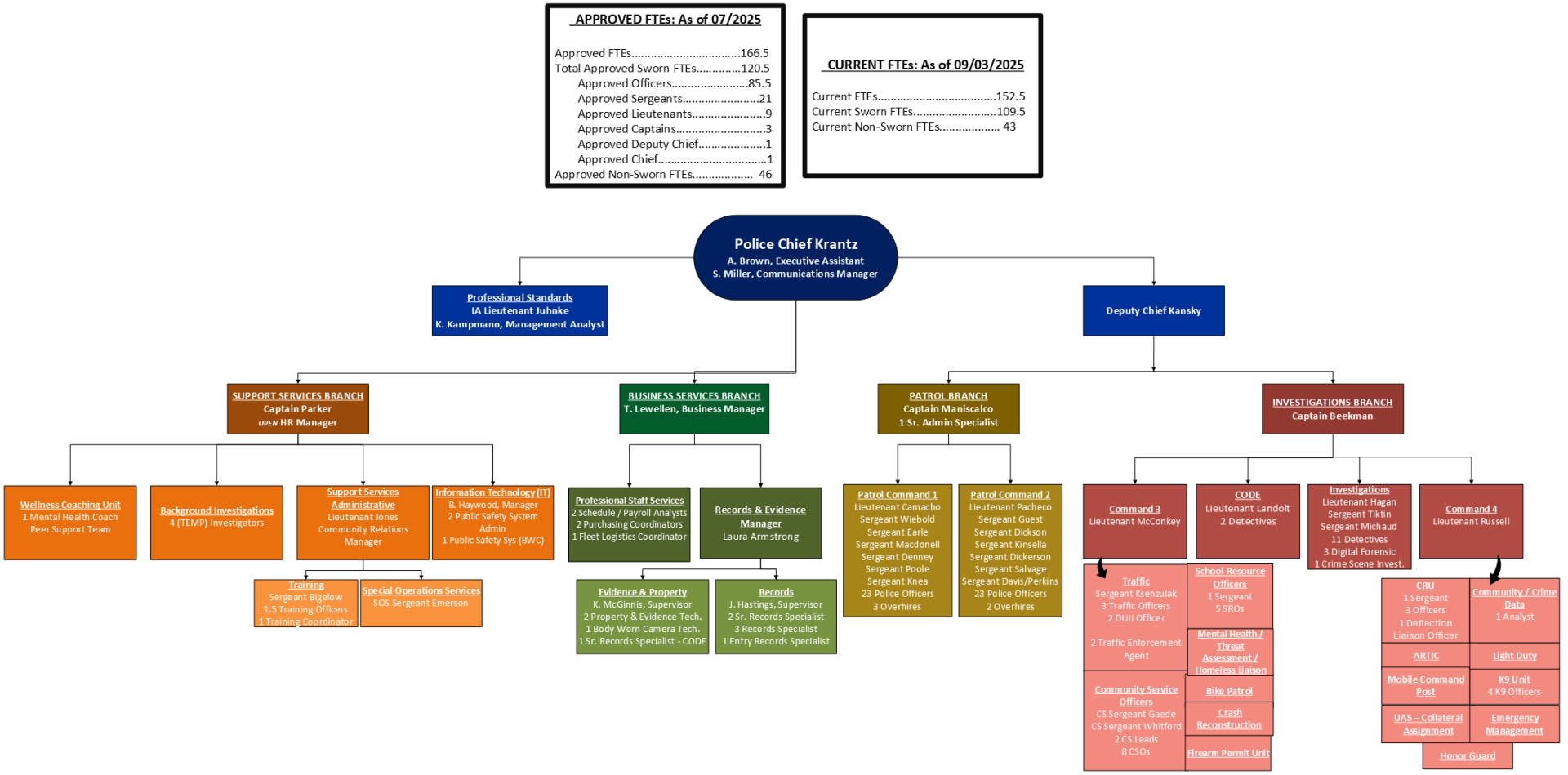 The Bend Police Department has two types of employees: sworn officers and non-sworn staff. Non-sworn staff work in areas like Evidence, Technology, Records, Crime Analysis, and Support Services. Sworn officers are police officers who can make arrests and carry out law enforcement duties. They work in different teams, such as Investigations, K9 (dog unit), Patrol, School Resource Officers, Traffic, and Training.